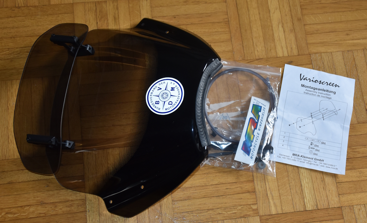 Original MRA Vario Touring Screen für Naked Bike“VTNB alle Baujahre“Kleine Scheibe mit großer Wirkung, die stufenlos im gewünschten Winkel montiert werden kann und über einen Spoiler verfügt, der sich in sieben Positionen auf die individuellen Bedürfnisse des Fahrers einstellen lässt.ABE/KBA Gravierung ist auf der Scheibe.Rasterdruck: Ja,Länge in mm: 335, Breite in mm: 400